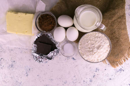 Ingredients for making chocolate cake: flour, chocolate, cocoa, eggs, almonds, brown sugar, butter on a gray textured background. Cooking delicious homemade food