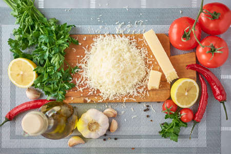 Set of products for cooking traditional italian pasta. Raw ingredients - spaghetti, cheese, tomatoes, garlic, olive oil, and seasonings.
