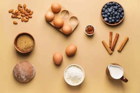Baking cake ingredients - bowl, flour, eggs, tomato