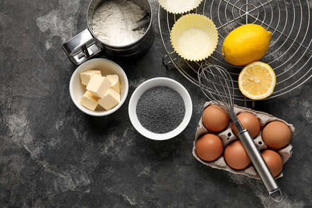 Ingredients for making traditional homemade lemon cake, fresh summer baking items
