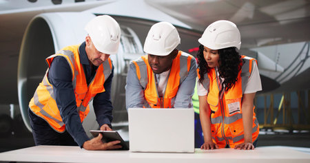 African American Supervisor Inspects Aircraft While Hispanic Technician Repairs Engine.
