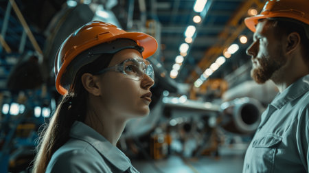 A woman and a man in hard hats and safety glasses look at an airplane engine.