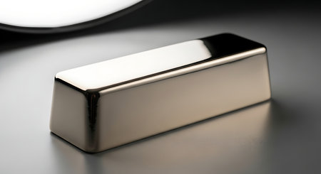 A stunning close-up view of a shiny gold bar resting on a metallic surface, capturing warm light reflections, symbolizing wealth and luxury.