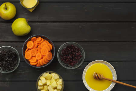 Tzimmes ingredients: carrot, apples, honey, dried prunes and cranberries. Tsimmes is a traditional Ashkenazi Jewish sweet stew