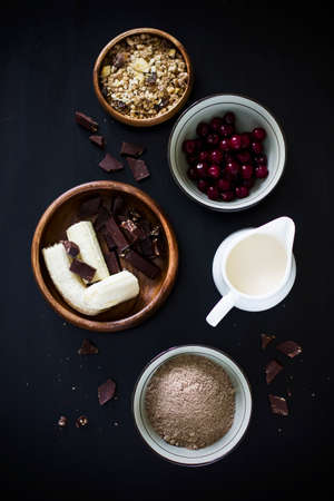 Muffins ingredients: milk, muesli, frozen cherry, flax flour, banana and chocolate. Vertical, black background