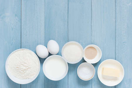 Background with ingredients for baking on the textured blue wooden table. Copy space