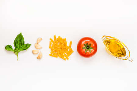Top view of pasta ingredients over white background - raw fusilli, fresh basil, garlic cloves, olive oil and ripe tomatoe. Italian food minimal concept