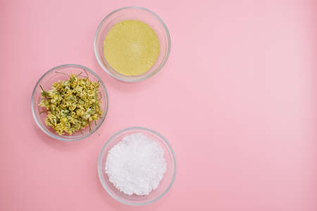 Dried chamomile, yellow clay and sea salt in a glass bowl on a pink pastel background with copyspace. The concept of creating natural cosmetics and home personal care.