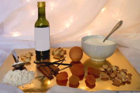 Ingredients for a peach and pistachio cake. Festive holiday background. Selective focus.