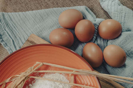 Cake baking ingredients on a wooden background, isolated , above vantage point photography