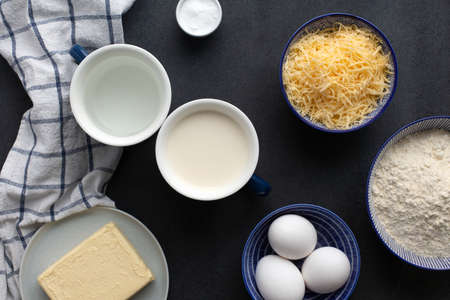 Ingredients for Traditional French Gougeres - savory cheese pastry flour, eggs, butter, milk, water, cheese and salt. Flat lay on dark gray background