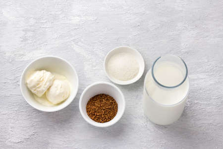 Ingredients for dalgona coffee. Instant coffee, milk, ice cream and sugar. Light gray textured background, top view