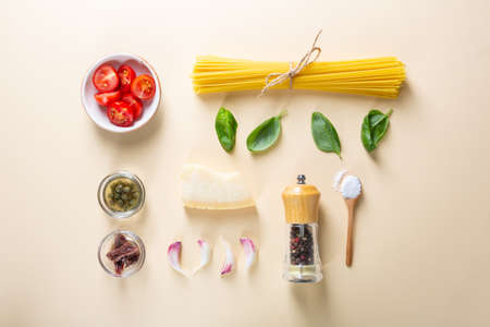 composition of healthy food ingredients on yellow white background, top view. Ingredients for making macron, spaghetti, pasta. Tomatoes, basil, parmesan cheese, grater
