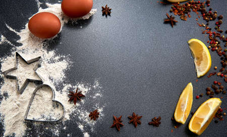 Christmas time cooking concept with flour and cookies forms on dark wooden table