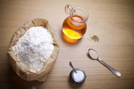 Ingredients for bread with saffron: flour, saffron water, yeast and salt on light wooden background. Toned.