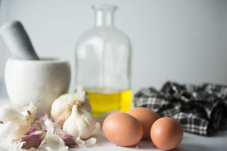 close up shot top view olive oil surrounded by cooking ingredients. High quality beautiful photo concept