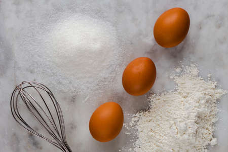 Top view of brown eggs, sugar, flour as ingredients and whisk on marble background
