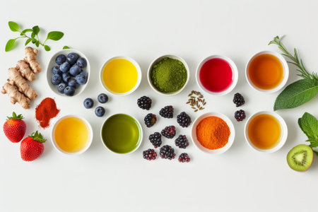 Flat lay of various superfoods including berries, spices, and several types of herbal teas, arranged neatly on a white background.