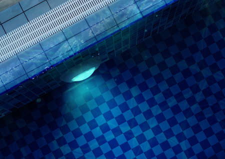 Bottom of a swimming pool with small blue tiles seen through the refreshing water in summer.
