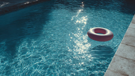 A colorful inflatable ring drifts in clear blue water of a swimming pool beneath a bright sun. The relaxing atmosphere invites a perfect day for leisure and fun.