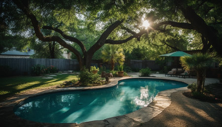 Clear blue pool with shadows of nearby trees, peaceful and empty, copy space