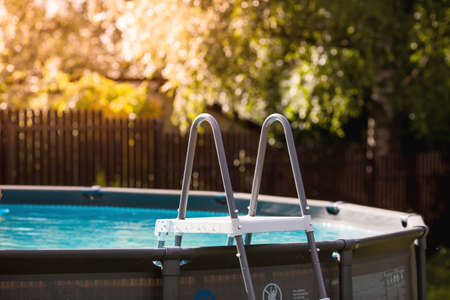 Swimming pool with metal frame for home and garden. Frame swimming pool in the yard. Solar banner.Installation of the pool. The concept of summer holidays and recreation.