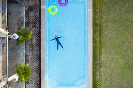 Cute adorable girl floating on back in water pool on backyard. Kid child enjoying having fun in swimming pool. Summer outdoor water activity for kids. View from above overhead.