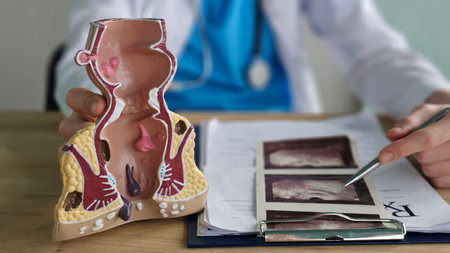 A doctor examines an anatomical model of the anus and rectum