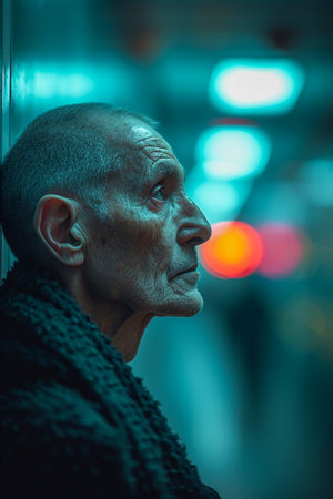 An elderly man stands on a busy street wearing a knit hat and a warm coat. Raindrops fall as colorful lights from cars blur in the background creating a moody atmosphere.