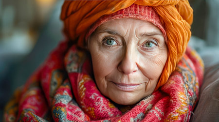 Portrait of an elderly woman with blue eyes and an orange headscarf.