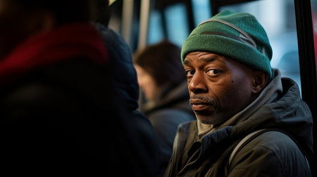 Handsome african american man in beige coat and headscarf standing in subway train.