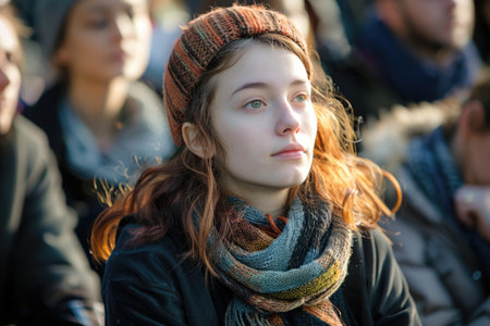 A young woman wearing a knitted scarf and hat gazes thoughtfully into the distance amidst a crowd of people.