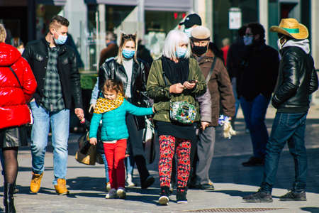 Reims France February 27, 2021 Unidentified pedestrians with a face mask to protect themself from the coronavirus walking in the streets of Reims during the pandemic affecting France