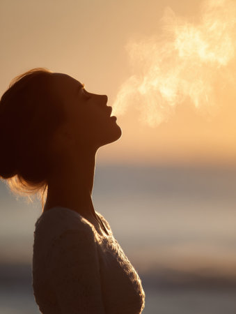 A woman stands at the beach, exhaling vapor as the sun sets over the horizon, creating a peaceful atmosphere by the ocean waves.
