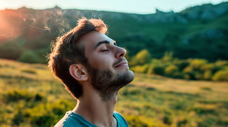 A Young Man Embraces Nature s Tranquility, Eyes Closed, Seeking Fresh Air and Sunlight Outdoors