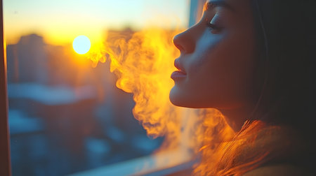 A close-up of a serene woman with her eyes closed, peacefully exhaling in the cold air. Her warm breath is visible as steam, beautifully illuminated by the golden light of sunset, symbolizing relaxation, mindfulness, and the simple act of breathing.