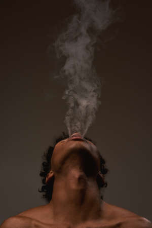 A man is smoking a cigarette and his face is covered in smoke. Concept of addiction and the negative effects of smoking on one's health