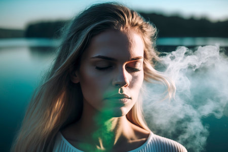 pretty woman exhaling smoke near a serene lake, surrounded by nature during daylight