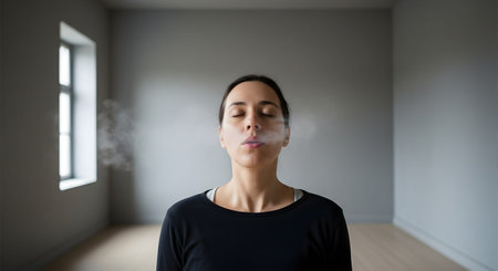 A woman stands still in a foggy space, eyes closed, experiencing a moment of stillness. The mist surrounds her, creating a soft atmosphere as she focuses on her thoughts.