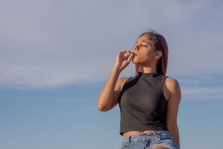 Vape teenager. Young pretty white caucasian girl with glasses on her head an electronic cigarette on the street in the summer. Deadly bad habit.