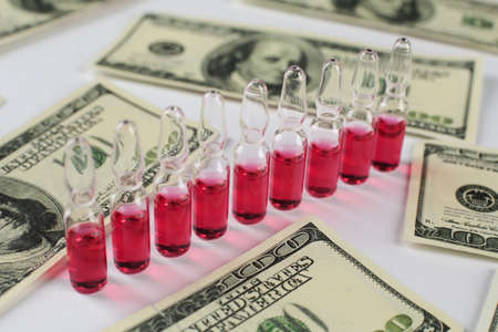 Glass vials with medical vaccine red and dollars on a white background