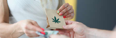 The woman gives money and receives bag marijuana