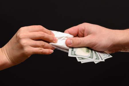 Hand of addict man with money buying dose of cocaine or heroine or another narcotic from drug dealer. Drug abuse and traffic concept.