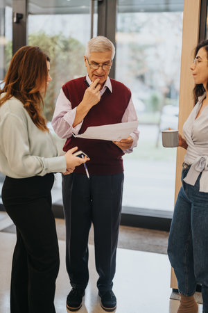 Senior manager reviewing documents with colleagues in office environment.