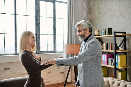 Happy young caucasian woman shaking hand of psychotherapist