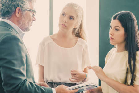 Mature expert with notepad meeting and talking to young entrepreneurs. Business people in office interior. Medium shot. Loan inspector or auditor concept