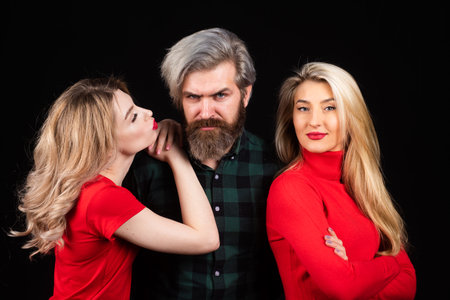 Man and two beautiful women on dark background. Polyamory concept