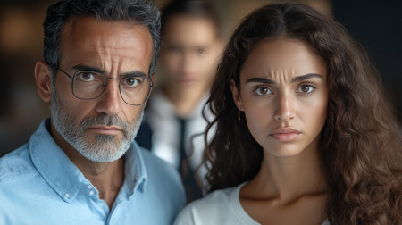 A middle aged couple expresses their anger towards each other, with furrowed brows and piercing gazes. The studio's soft lighting enhances their emotional confrontation.