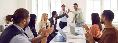 Mixed race business team celebrating good results in office meeting. Happy young black man gives high five to coworker while diverse multi ethnic teammates are applauding. Teamwork and success concept
