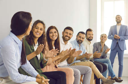 Business people clapping in the conference room. Smiling men and women sitting in a row applauding their female colleague at a team meeting. Concept of conferences, seminars, teamwork brainstorming